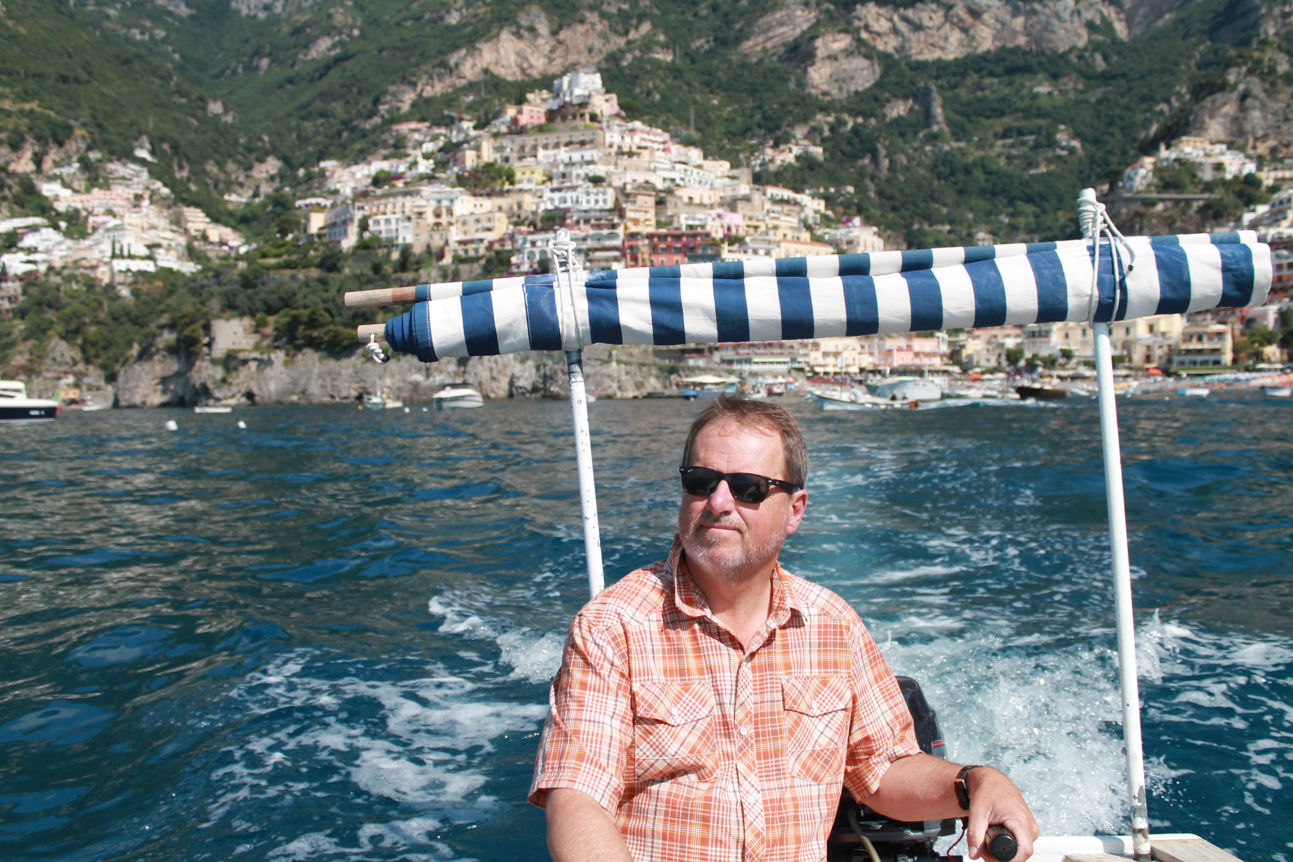Today, we rented a boat and puttered up and down the coast. We packed “mortadella, parma, mozzarella, e pane” and lots of “acqua” and Sarah lived out her Jackie O fantasies!