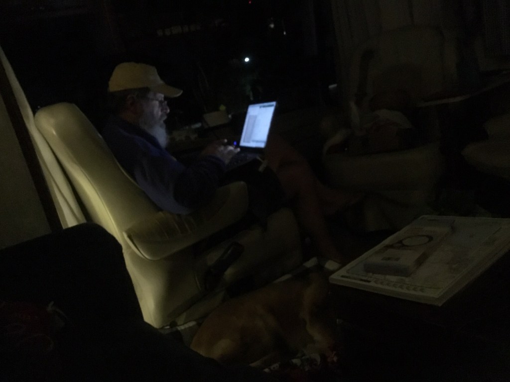 In practical terms, the longest night of our year gave us time to research and learn all about the three different electrical systems in Cornelia. Our carbon-monoxide monitor started beeping to alert us to dead coach batteries – no CO poisoning! Even though we were plugged in to 50-amp shore power here at the campground, our cabin lights dimmed and then failed. It turns out that the converter that keeps the coach batteries charged is not doing a good job of converting the shore power into battery power which in turn powers the house lights. We resolved the problem by starting the RV engine to recharge the house batteries, and strung Christmas lights and set up two lamps powered by AC sockets to avoid needing the house lights. Stay tuned to find out if Santa brings us a new converter!