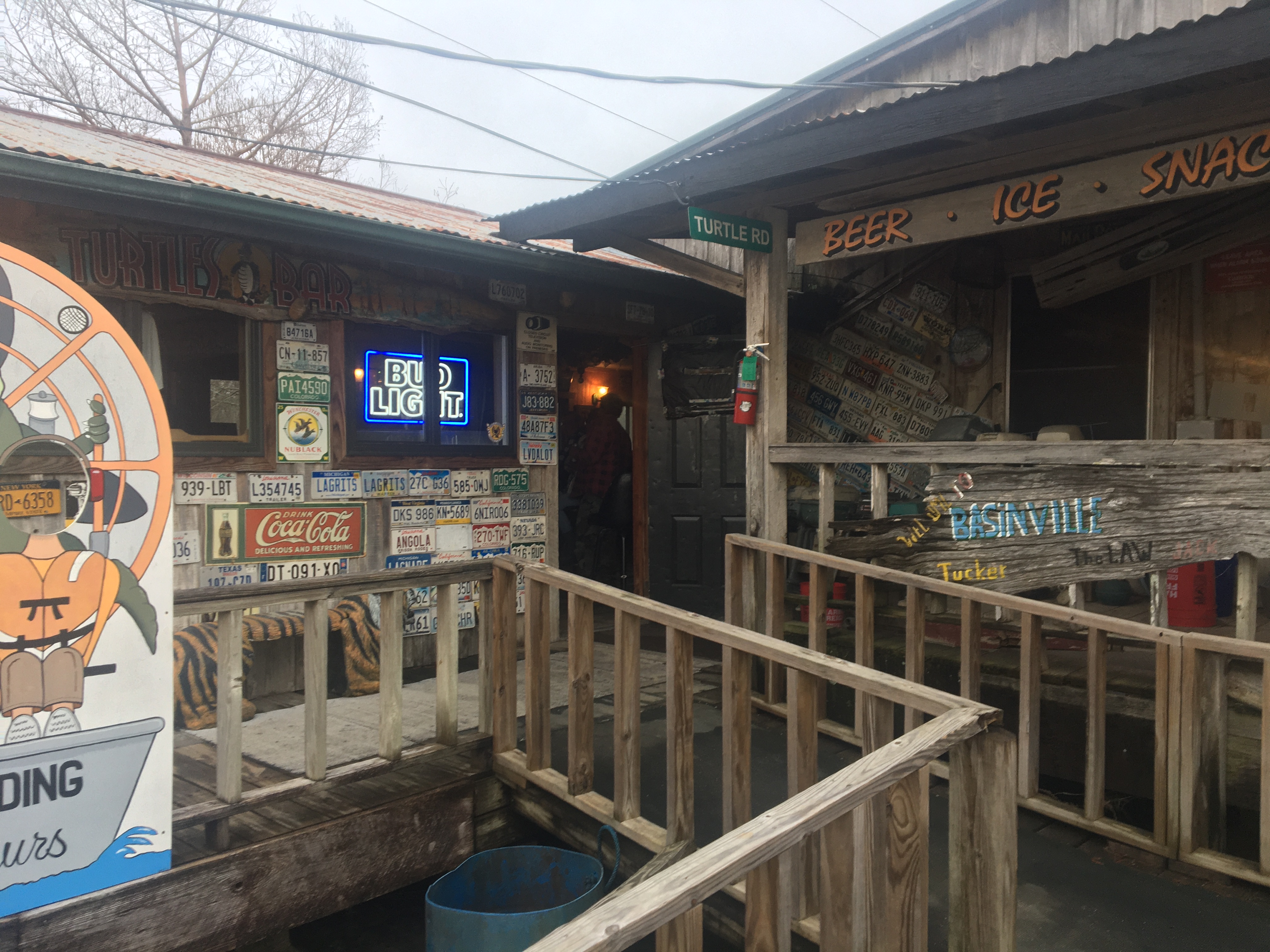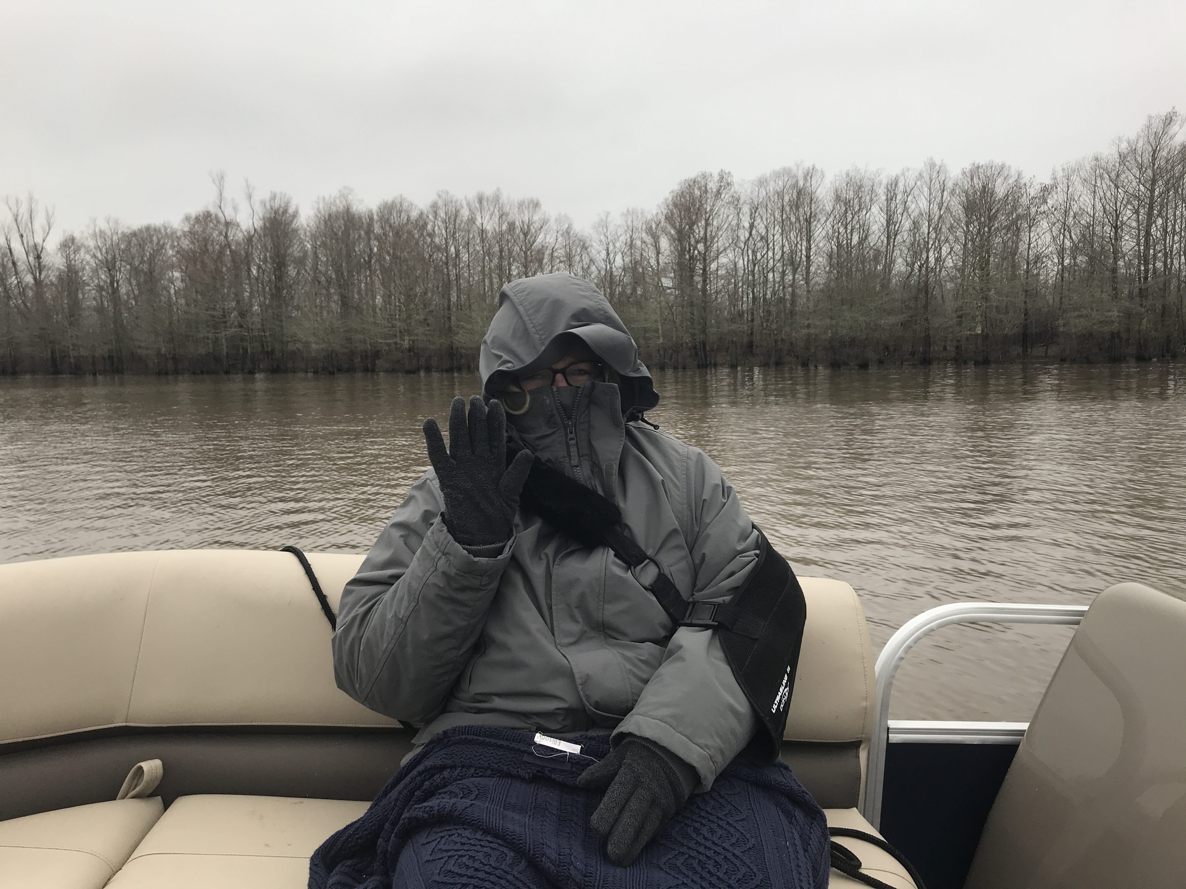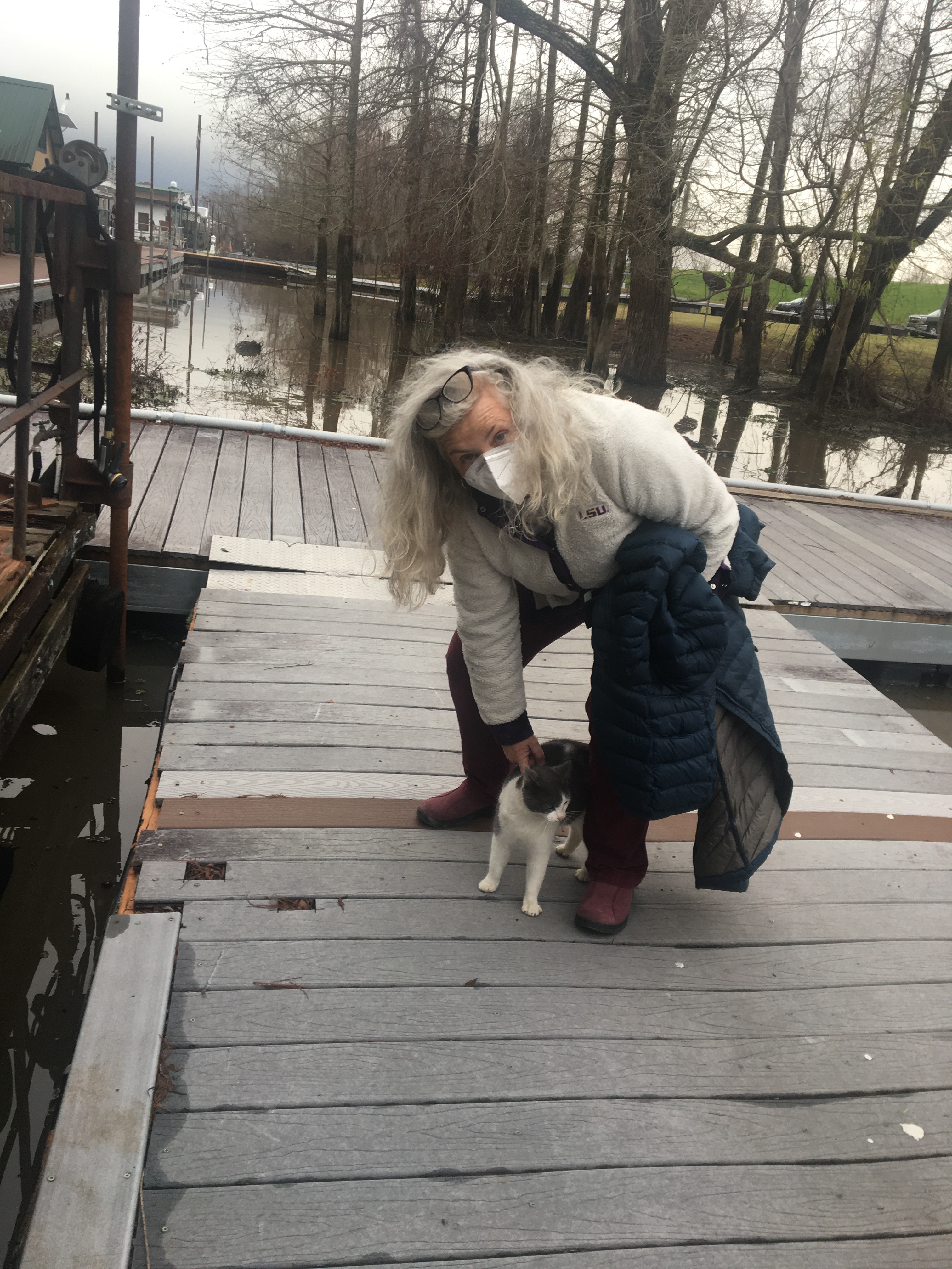 After a leisurely lunch at Chez Jacqueline’s in Breaux Bridge, we were treated to a winter boat tour of the bayou near Atchafalaya Basin Landing. To warm up when we returned to shore, we grabbed some beers on the porch of Turtle Bar, where the resident dock cat curled up with Sarah for a nap. Of course.