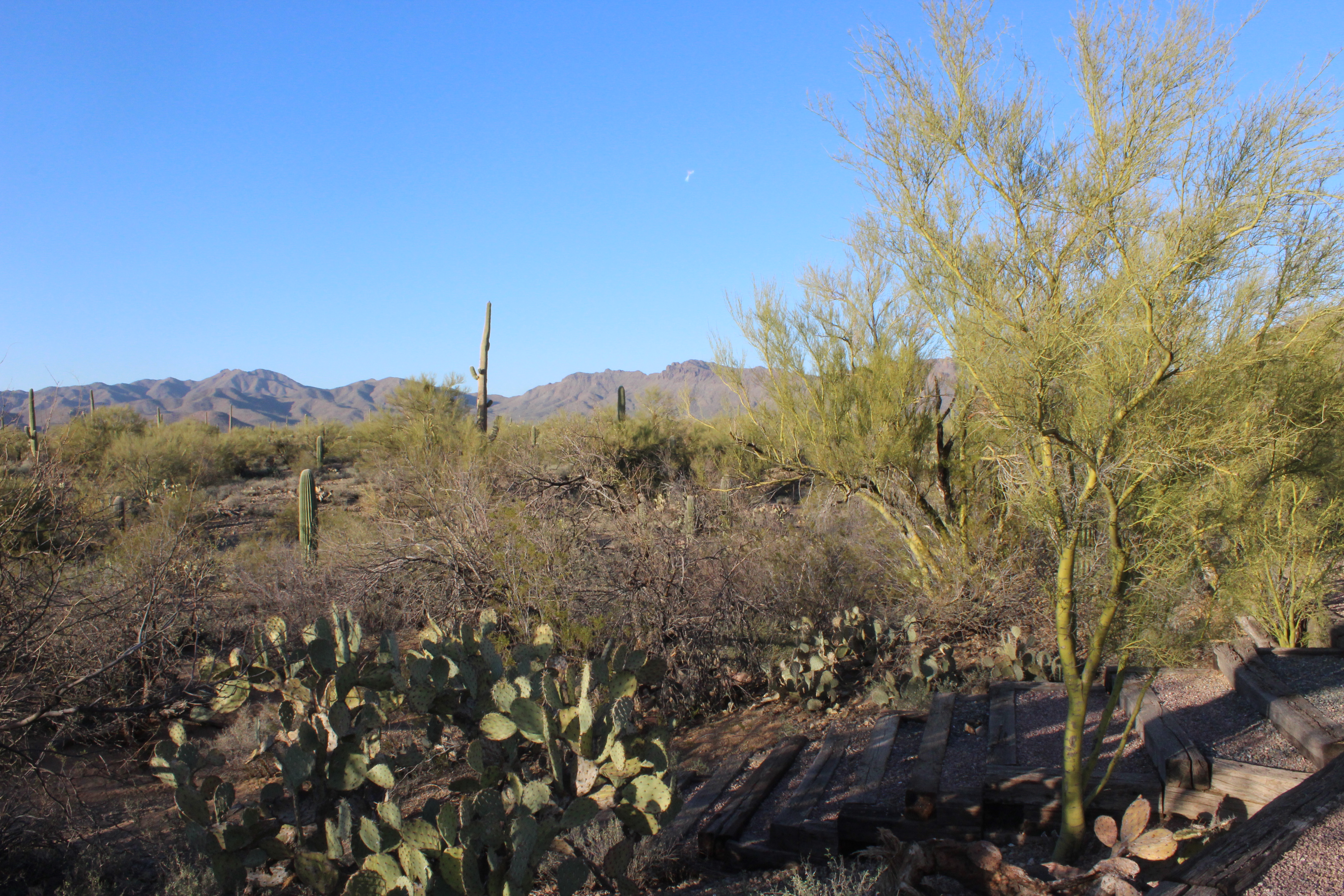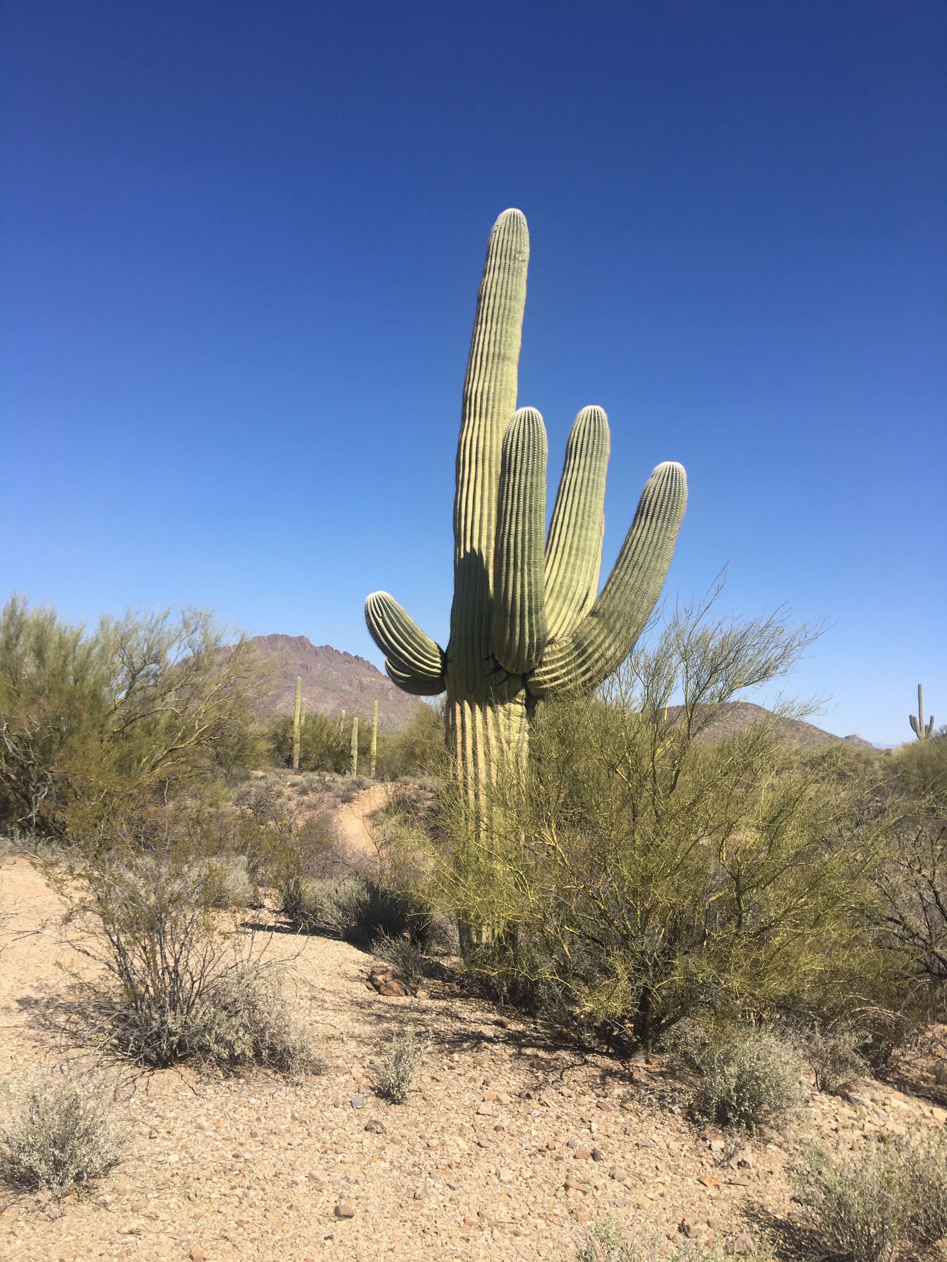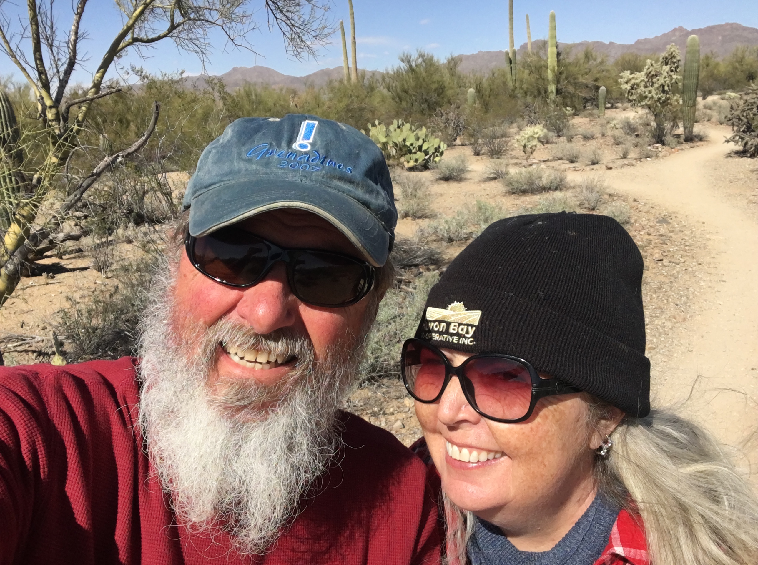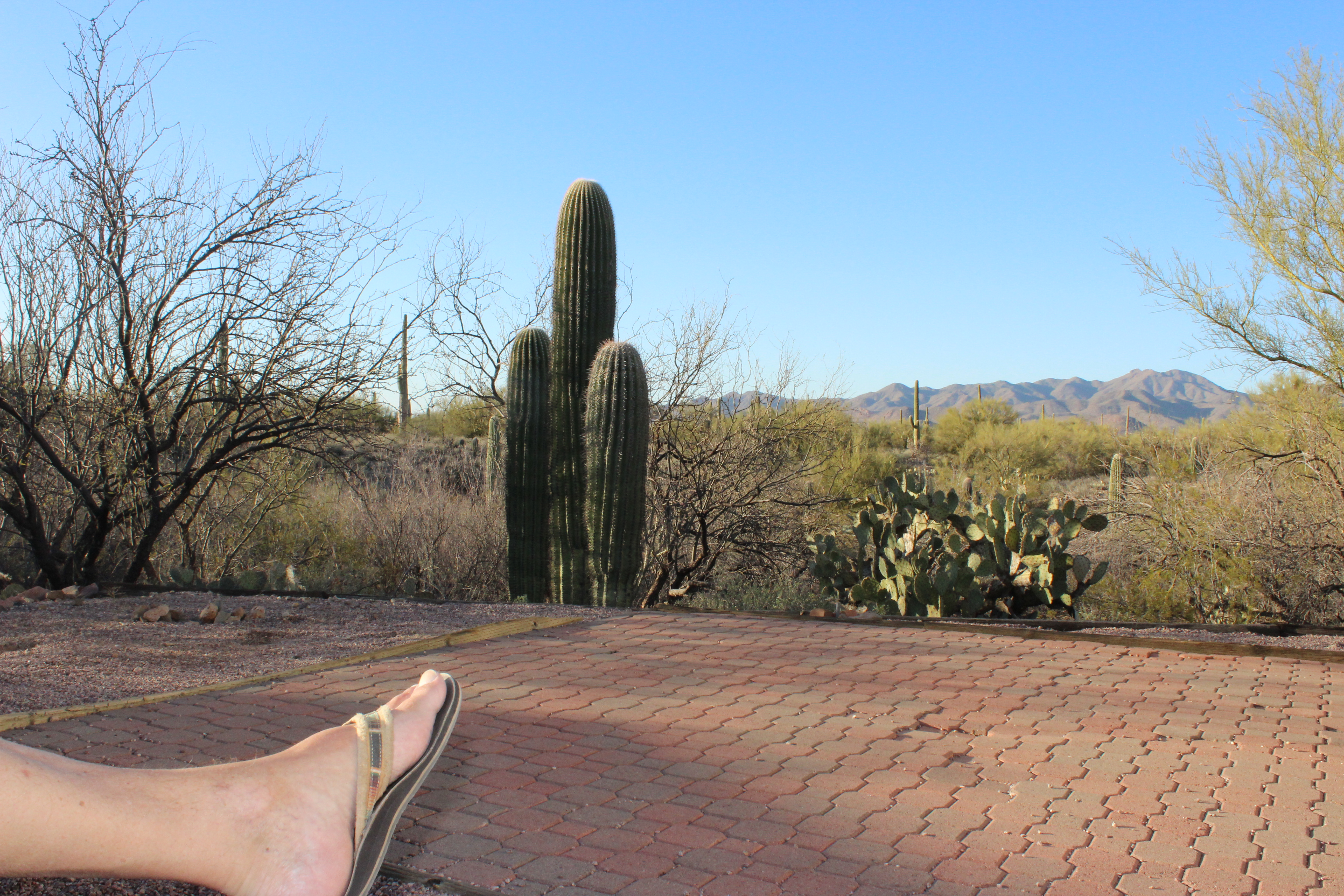 But our experience with living on the edge of the Sonoran Desert near Tucson, AZ confirms for us that the desert is teeming with a variety of plant and animal life. A pair of Great Horned Owls and singing coyotes serenaded us each night this week. At dawn and dusk, the bunnies and mourning doves were busy. One morning, a Gila woodpecker amused Sarah by tapping fruitlessly on a neighbor’s plastic TV antenna atop their trailer. And the Saguaro are endlessly fascinating in their assortment of sizes and shapes.