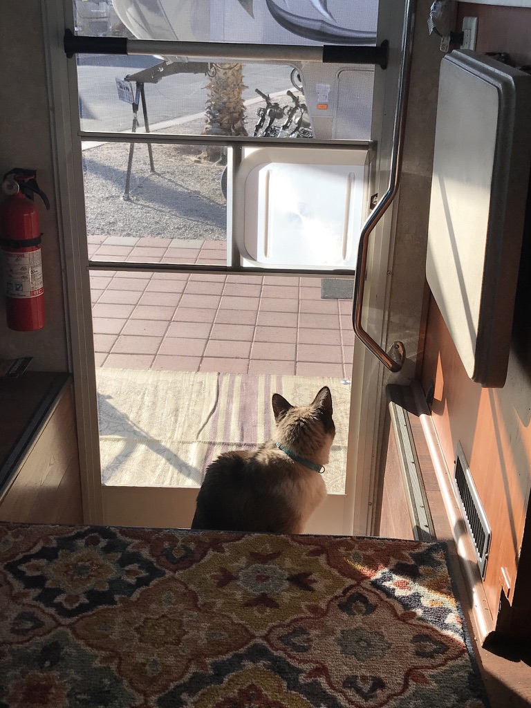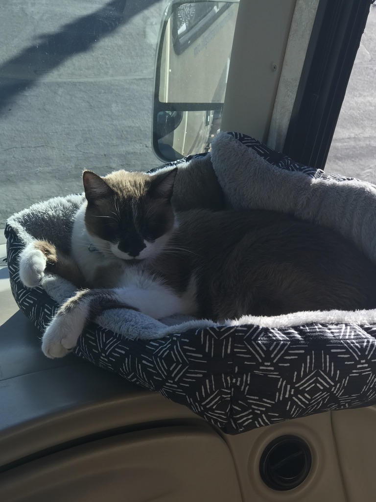 After a few days of decompressing, he is now settling into the rhythms of RV resort life and has claimed favorite perches in the front window, the stairwell, the end of the couch, and the middle of the bed. We are falling in love with him more and more each day.